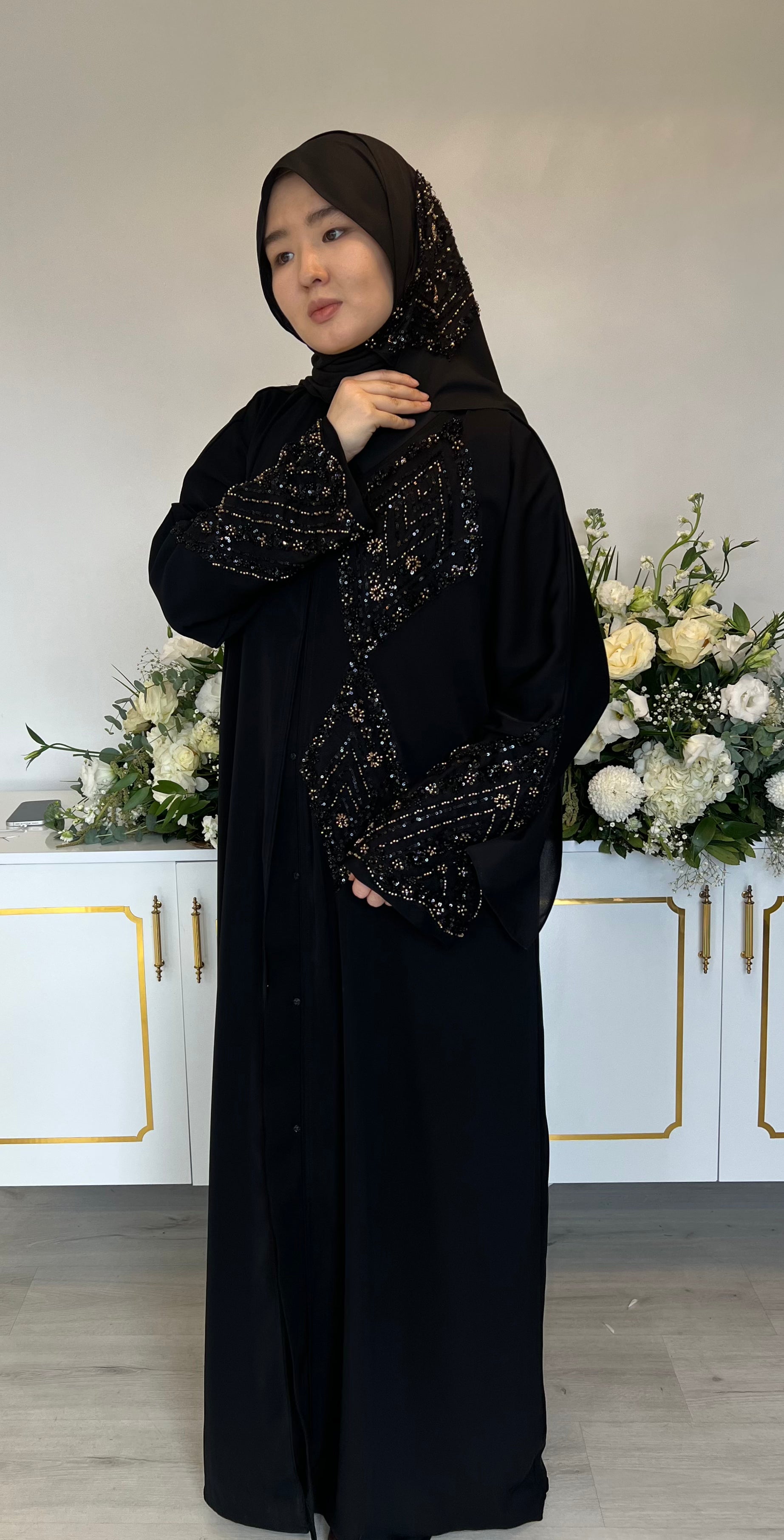 Özenle yerleştirilmiş boncuk detayları abayaya ışık ve hareket katarken, takım halinde sunulan baş örtüsü ile bütünlüklü ve kusursuz bir görünüm elde edilir. Hem özel davetlerde hem de şık günlük kullanımlarda rahatlıkla tercih edilebilen Letafet Model, zarafeti ön planda tutan ve albenisi yüksek bir stil arayanlar için özel olarak tasarlanmıştır.