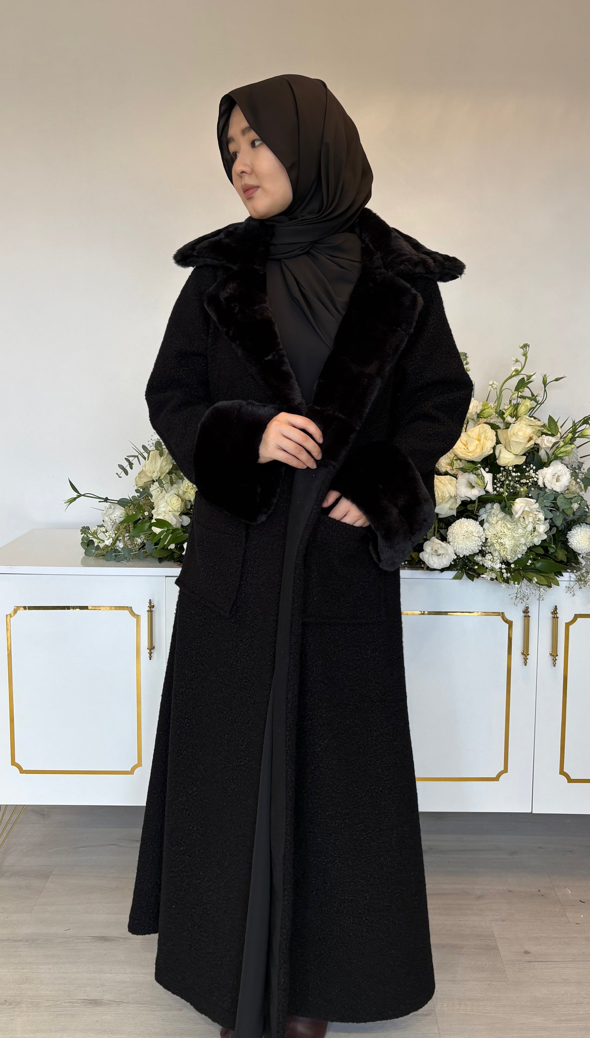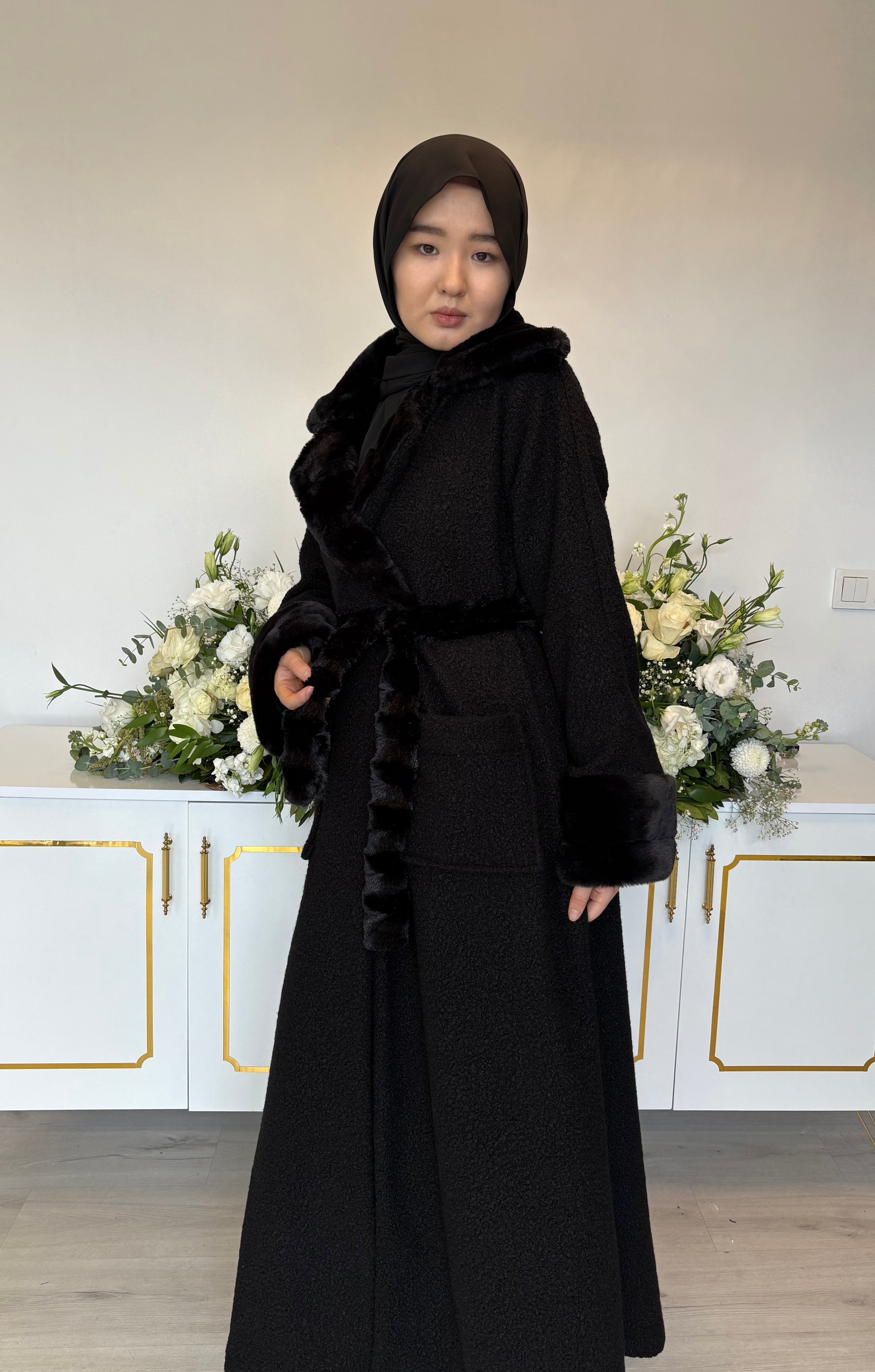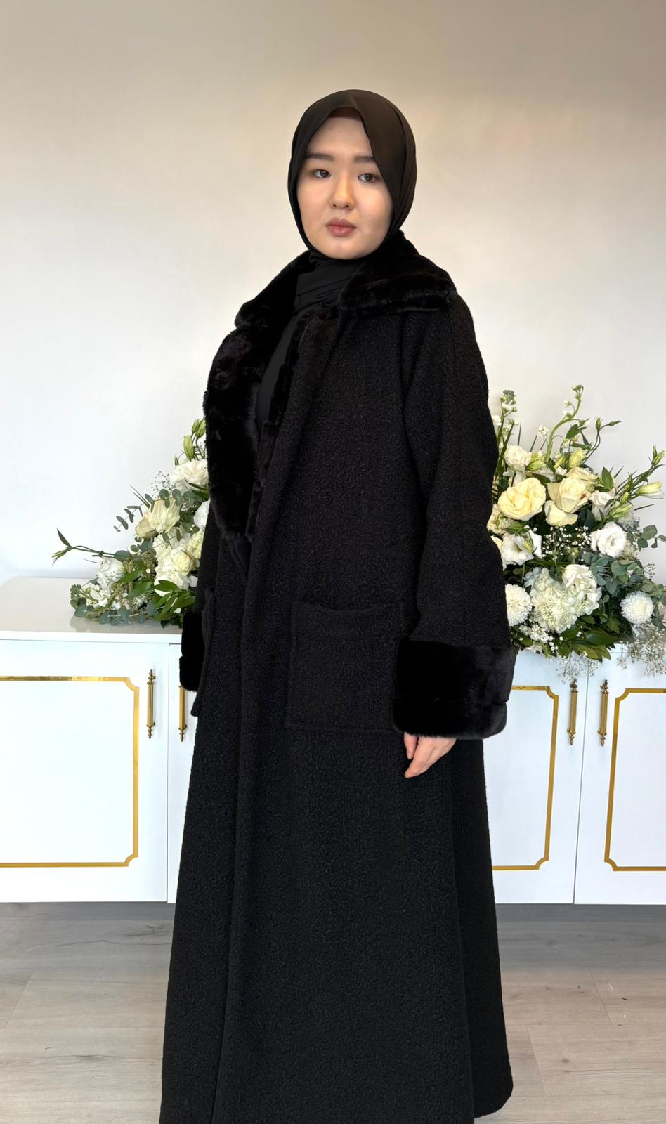 Siyah kuzu kaşe kumaşın tok ve kaliteli duruşunu, siyah peluş detayların yumuşak dokusuyla birleştiren Mila Model kabanımız; kış şıklığını güçlü ve zarif bir çizgide sunar. Ceket yakası, modele klasik ve net bir siluet kazandırırken peluş detaylar tasarıma sıcak ve sofistike bir hava katar.